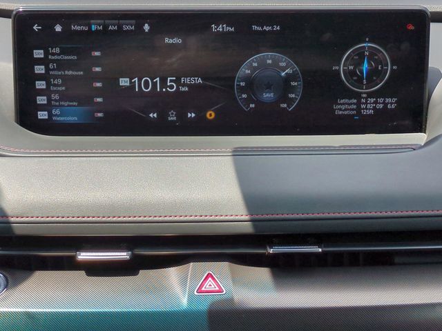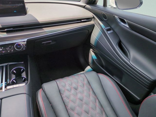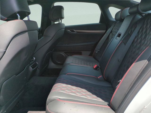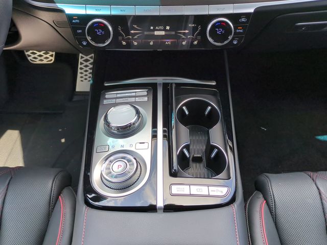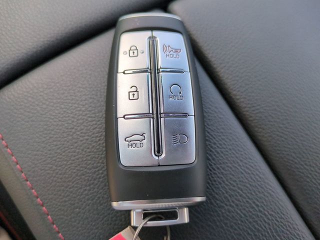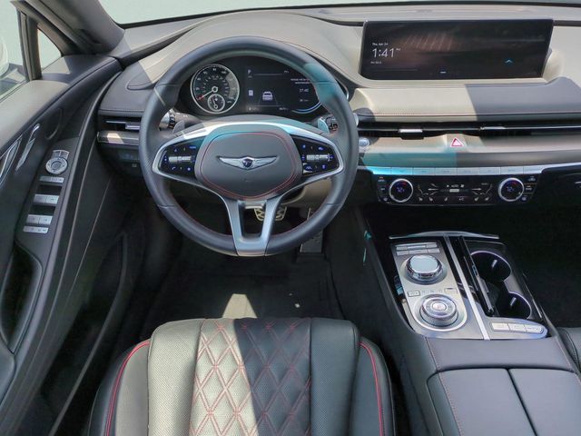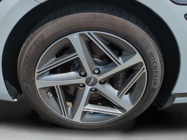 This vehicle comes equipped with Option Group 01, Genesis Certified, 12 Speakers, 4-Wheel Disc Brakes, ABS brakes, Adaptive suspension, Air Conditioning, Alloy wheels, AM/FM radio: SiriusXM, Android Auto & Apple CarPlay, Anti-whiplash front head restraints, Auto High-beam Headlights, Auto tilt-away steering wheel, Auto-dimming door mirrors, Auto-dimming Rear-View mirror, Automatic temperature control, Bumpers: body-color, Compass, Delay-off headlights, Driver door bin, Driver vanity mirror, Dual front impact airbags, Dual front side impact airbags, Electronic Stability Control, Emergency communication system: Genesis Connected Services, Exterior Parking Camera Rear, First Aid Kit, Four wheel independent suspension, Front anti-roll bar, Front Bucket Seats, Front Center Armrest, Front dual zone A/C, Front reading lights, Fully automatic headlights, Garage door transmitter: HomeLink, Heated & Ventilated Front Bucket Seats, Heated door mirrors, Heated front seats, Heated rear seats, Heated steering wheel, Illuminated entry, Knee airbag, Leather Seating Surfaces, Leather steering wheel, Low tire pressure warning, Memory seat, Navigation System, Occupant sensing airbag, Outside temperature display, Overhead airbag, Overhead console, Panic alarm, Passenger door bin, Passenger vanity mirror, Power door mirrors, Power driver seat, Power moonroof, Power passenger seat, Power steering, Power windows, Radio data system, Radio: AM/FM/HD/SiriusXM Audio System, Rain sensing wipers, Rear anti-roll bar, Rear Bumper Applique, Rear reading lights, Rear seat center armrest, Rear side impact airbag, Rear window defroster, Remote keyless entry, Reversible Cargo Tray, Security system, Speed control, Speed-sensing steering, Speed-Sensitive Wipers, Steering wheel memory, Steering wheel mounted audio controls, Tachometer, Telescoping steering wheel, Tilt steering wheel, Traction control, Trip computer, Turn signal indicator mirrors, Variably intermittent wipers, Ventilated front seats, and Wheels: 19"x8.5J Fr & 19"x9.5J Rr Sport Alloy .