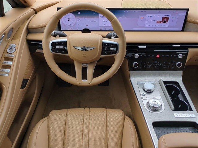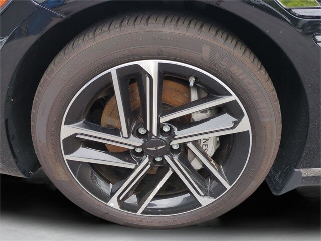 This vehicle comes equipped with Option Group 01, Genesis Certified, 18 Speakers, 4-Wheel Disc Brakes, ABS brakes, Air Conditioning, Alloy wheels, AM/FM radio: SiriusXM, Android Auto & Apple CarPlay, Anti-whiplash front head restraints, Auto High-beam Headlights, Auto tilt-away steering wheel, Auto-dimming door mirrors, Auto-dimming Rear-View mirror, Automatic temperature control, Bumpers: body-color, Compass, Delay-off headlights, Driver door bin, Driver vanity mirror, Dual front impact airbags, Dual front side impact airbags, Electronic Stability Control, Emergency communication system: Genesis Connected Services, Exterior Parking Camera Rear, First Aid Kit, Four wheel independent suspension, Front anti-roll bar, Front Bucket Seats, Front Center Armrest, Front dual zone A/C, Front reading lights, Fully automatic headlights, Garage door transmitter: HomeLink, Genuine wood console insert, Genuine wood dashboard insert, Genuine wood door panel insert, Heated door mirrors, Heated front seats, Heated rear seats, Heated steering wheel, Illuminated entry, Knee airbag, Leather steering wheel, Leatherette Seating Surfaces, Low tire pressure warning, Memory seat, Mudguards, Navigation System, Occupant sensing airbag, Outside temperature display, Overhead airbag, Overhead console, Panic alarm, Passenger door bin, Passenger vanity mirror, Power door mirrors, Power driver seat, Power moonroof, Power passenger seat, Power steering, Power windows, Radio data system, Rain sensing wipers, Rear air conditioning, Rear anti-roll bar, Rear reading lights, Rear seat center armrest, Rear side impact airbag, Rear window defroster, Remote keyless entry, Security system, Speed control, Speed-sensing steering, Speed-Sensitive Wipers, Steering wheel memory, Steering wheel mounted audio controls, Tachometer, Telescoping steering wheel, Tilt steering wheel, Traction control, Trip computer, Turn signal indicator mirrors, Variably intermittent wipers, Ventilated front seats, and Wheel Locks .