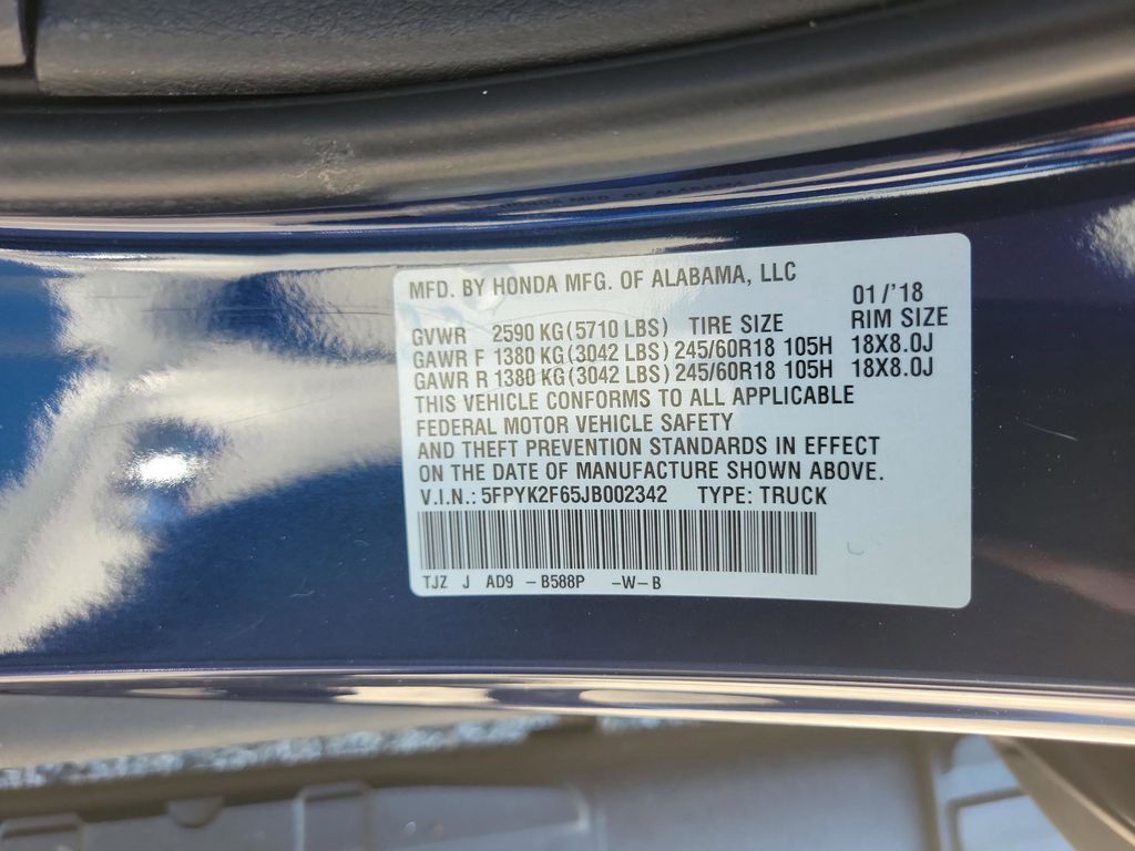 Certification Program Details: Certified Select Details: * Roadside Assistance * Limited Warranty: 6 Month/6,000 Mile (whichever comes first) from original in-service date * Warranty Deductible: $100 * Vehicles with less than 100,000 miles on odometer - GTR/NV not eligible. 1 prepaid service visit included with first year of ownership (excludes EVs). Certification Fee - Only $199. * Transferable Warranty * Vehicle History * 84 Point Inspection Odometer is 14990 miles below market average! Blue 19/26 City/Highway MPG 2018 Honda Ridgeline RTL-T FWD 6-Speed Automatic 3.5L V6 SOHC i-VTEC 24V