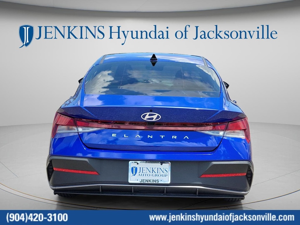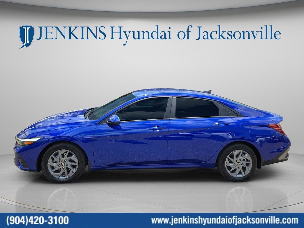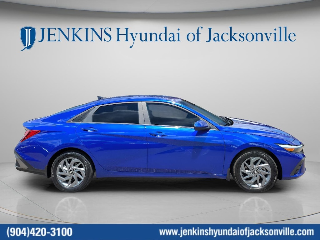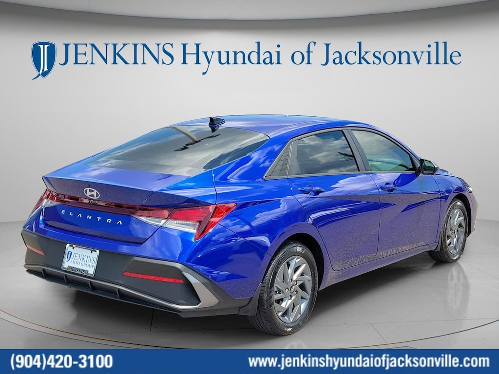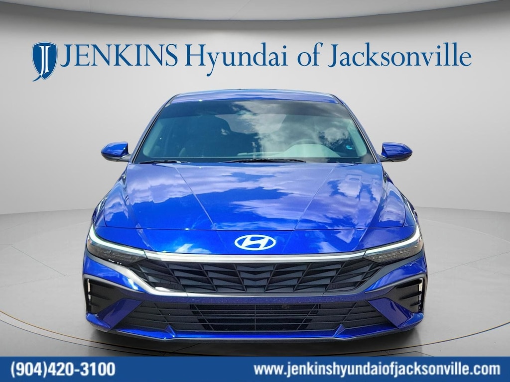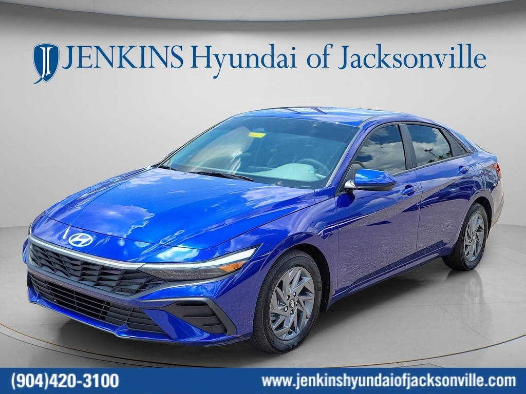 CARFAX One-Owner. Clean CARFAX. This 2024 Hyundai Elantra SEL in Intense Blue features Option Group 01, 16" x 6.5J Alloy Wheels, 4-Wheel Disc Brakes, 6 Speakers, ABS brakes, Air Conditioning, Alloy wheels, AM/FM radio: SiriusXM, Apple CarPlay & Android Auto, Auto High-beam Headlights, Automatic temperature control, Brake assist, Bumpers: body-color, Carpeted Floor Mats, Cloth Seat Trim, Delay-off headlights, Driver door bin, Driver vanity mirror, Dual front impact airbags, Dual front side impact airbags, Electronic Stability Control, Emergency communication system: Bluelink+, Exterior Parking Camera Rear, First Aid Kit, Front anti-roll bar, Front Bucket Seats, Front Center Armrest, Front dual zone A/C, Front reading lights, Front wheel independent suspension, Fully automatic headlights, Illuminated entry, Low tire pressure warning, Mudguards, Navigation System, Occupant sensing airbag, Outside temperature display, Overhead airbag, Overhead console, Panic alarm, Passenger door bin, Passenger vanity mirror, Power door mirrors, Power steering, Power windows, Radio: AM/FM/HD/SiriusXM Display Audio, Rear side impact airbag, Rear window defroster, Remote keyless entry, Reversible Cargo Tray, Security system, Speed control, Speed-sensing steering, Steering wheel mounted audio controls, Tachometer, Telescoping steering wheel, Tilt steering wheel, Traction control, Trip computer, Trunk/Cargo Hook, Variably intermittent wipers, and Wheel Locks . Visit our showroom 24/7 at Jenkinshyundaiofjacksonville or call 904-420-3100. FWD