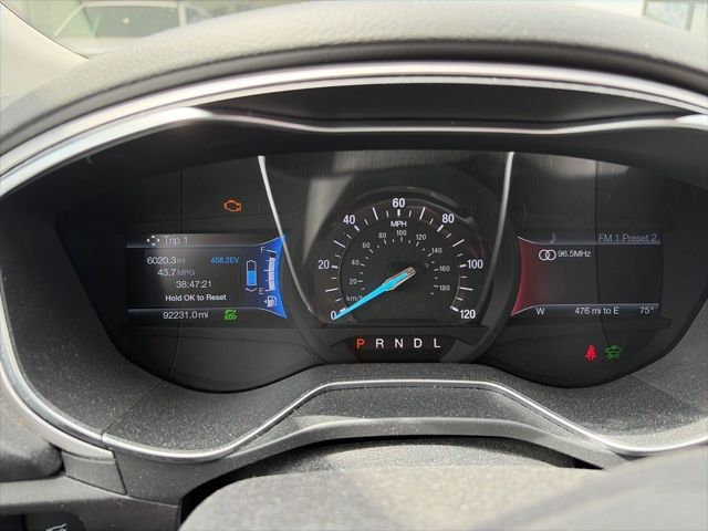 This vehicles comes equipped with Appearance Package (17" 10-Spoke Aluminum Wheels, Fog Lamps, Leather-Wrapped Steering Wheel, and Rear Spoiler), Equipment Group 501A, SE MyFord Touch Technology Package (110V Power Outlet, Reverse Sensing System, and SYNC w/MyFord Touch), I4 Hybrid, 17" Sparkle Silver Aluminum Wheels, 4-Wheel Disc Brakes, 6 Speakers, ABS brakes, Air Conditioning, Alloy wheels, AM/FM radio: SiriusXM, Automatic temperature control, Brake assist, Bumpers: body-color, CD player, Compass, Delay-off headlights, Driver door bin, Driver vanity mirror, Dual front impact airbags, Dual front side impact airbags, Eco Cloth Front Bucket Seats, Electronic Stability Control, Emergency communication system: 911 Assist, Exterior Parking Camera Rear, Four wheel independent suspension, Front anti-roll bar, Front Bucket Seats, Front Center Armrest, Front dual zone A/C, Front reading lights, Fully automatic headlights, Heated door mirrors, Illuminated entry, Knee airbag, Low tire pressure warning, Occupant sensing airbag, Outside temperature display, Overhead airbag, Overhead console, Panic alarm, Passenger door bin, Passenger vanity mirror, Power door mirrors, Power driver seat, Power passenger seat, Power steering, Power windows, Radio data system, Radio: AM/FM Stereo/MP3/Single-CD, Rear anti-roll bar, Rear reading lights, Rear seat center armrest, Rear window defroster, Remote keyless entry, Security system, SiriusXM Radio, Speed control, Speed-sensing steering, Speed-Sensitive Wipers, Split folding rear seat, Steering wheel mounted audio controls, SYNC Communications & Entertainment System, Tachometer, Telescoping steering wheel, Tilt steering wheel, Traction control, Trip computer, Turn signal indicator mirrors, Variably intermittent wipers, and Voice Activated Navigation . Recent Arrival! 44/41 City/Highway MPG