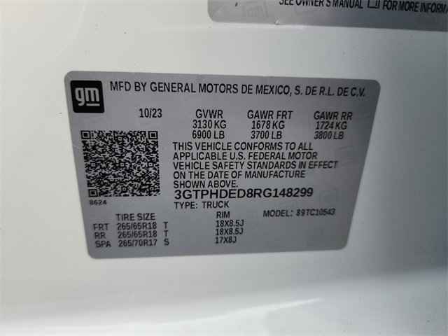 This vehicle comes equipped with Preferred Equipment Group 4SA (120-Volt Bed Mounted Power Outlet, 120-Volt Interior Power Outlet, 170 Amp Alternator, 2 Charge/Data USB Ports, 2 Type-C Charge-Only Rear USB Ports, 6-Speaker Audio System Feature, Auto-Locking Rear Differential, Auxiliary External Transmission Oil Cooler, Chrome Header & Chrome Grille Insert Bars, Color-Keyed Carpeting Floor Covering, Deep-Tinted Glass, Electric Rear-Window Defogger, Front Frame-Mounted Black Recovery Hooks, Front Rain-Sensing Wipers, GMC Connected Access Capable, HD Rear Vision Camera, Keyless Open & Start, LED Cargo Area Lighting, Manual Tilt-Wheel & Telescoping Steering Column, OnStar & GMC Connected Services Capable, Perimeter Lighting, Power Door Locks, Power Front Passenger Windows w/Express Up/Down, Power Front Windows w/Driver Express Up/Down, Power Rear Windows w/Express Down, Push Button Start, Rear Wheelhouse Liners, Remote Vehicle Starter System, SiriusXM w/360L, Steering Wheel Audio Controls, Theft Deterrent System (Unauthorized Entry), and Wi-Fi Hotspot Capable), Standard Suspension Package, Trailering Package (Hitch Guidance), 10-Speed Automatic, Jet Black Leather, 10-Way Power Driver Seat Adjuster w/Lumbar, 10-Way Power Passenger Seat Adjuster w/Lumbar, 3.23 Rear Axle Ratio, 4-Wheel Disc Brakes, 6 Speakers, ABS brakes, Air Conditioning, Alloy wheels, AM/FM radio: SiriusXM with 360L, Apple CarPlay/Android Auto, Auto High-beam Headlights, Auto-dimming door mirrors, Auto-dimming Rear-View mirror, Automatic Emergency Braking, Automatic temperature control, Brake assist, Buckle to Drive, Bumpers: chrome, Compass, Delay-off headlights, Deleted 3 Years of OnStar Remote Access, Driver door bin, Driver Memory, Driver vanity mirror, Dual front impact airbags, Dual front side impact airbags, Electronic Stability Control, Following Distance Indicator, Forward Collision Alert, Front 40/20/40 Split-Bench Seat, Front anti-roll bar, Front Center Armrest w/Storage, Front dual zone A/C, Front fog lights, Front Pedestrian Braking, Front reading lights, Front wheel independent suspension, Fully automatic headlights, Heated door mirrors, Heated Driver & Front Outboard Passenger Seating, Heated front seats, Heated steering wheel, Illuminated entry, IntelliBeam Automatic High Beam On/Off, Lane Keep Assist w/Lane Departure Warning, Low tire pressure warning, Memory seat, Navigation System, Occupant sensing airbag, Outside temperature display, Overhead airbag, Overhead console, Panic alarm, Passenger door bin, Passenger vanity mirror, Perf Leather-Appointed Front Outboard Seat Trim, Power door mirrors, Power driver seat, Power passenger seat, Power steering, Power windows, Premium audio system: GMC Infotainment System, Radio data system, Radio: Premium GMC Infotainment Audio System, Rain sensing wipers, Rear reading lights, Rear seat center armrest, Rear step bumper, Rear window defroster, Remote keyless entry, Security system, Speed control, Speed-sensing steering, Split folding rear seat, Steering wheel mounted audio controls, Tachometer, Telescoping steering wheel, Tilt steering wheel, Traction control, Trip computer, Variably intermittent wipers, Voltmeter, Wheels: 18 x 8.5 6-Spoke Machined Aluminum, and Wireless Apple CarPlay/Wireless Android Auto . Jenkins Chevrolet of Homosassa proudly serving Homosassa, Spring Hill, Hernando, Crystal River, Beverly Hills, Inverness. Just a half hour North of Buccaneer Bay. Come see the large, expansive inventory of the Jenkins Auto Group. 16/20 City/Highway MPG 10-Speed Automatic, Jet Black Leather. CARFAX One-Owner. Summit White 2024 GMC Sierra 1500 SLT RWD 10-Speed Automatic EcoTec3 5.3L V8