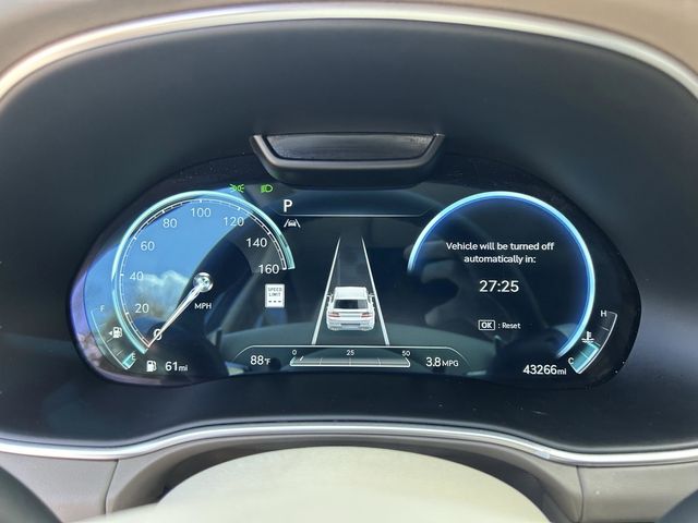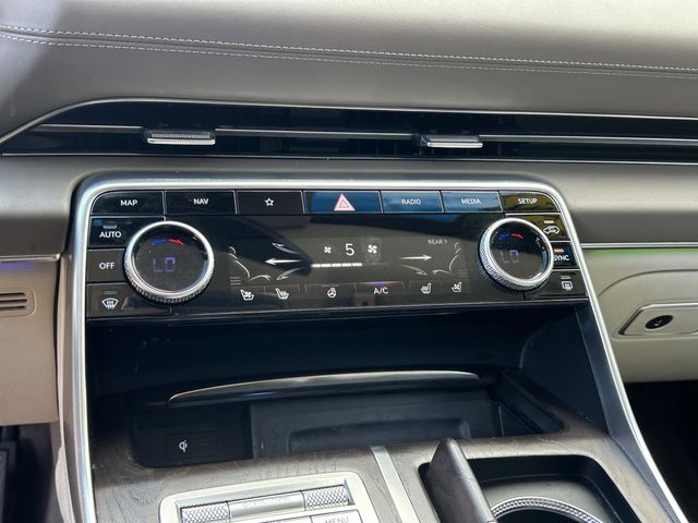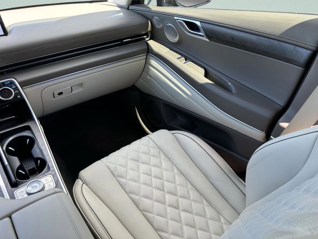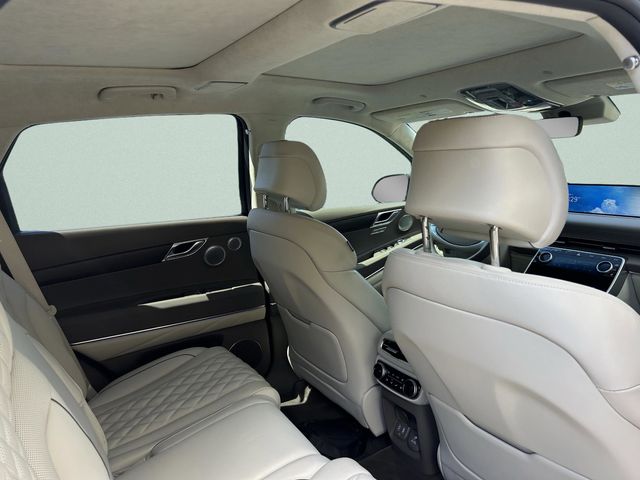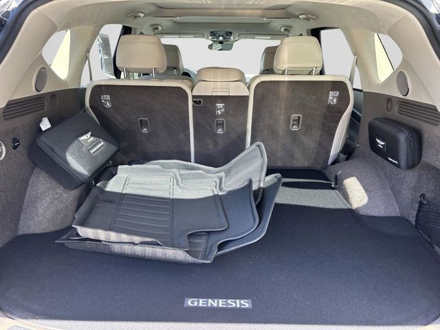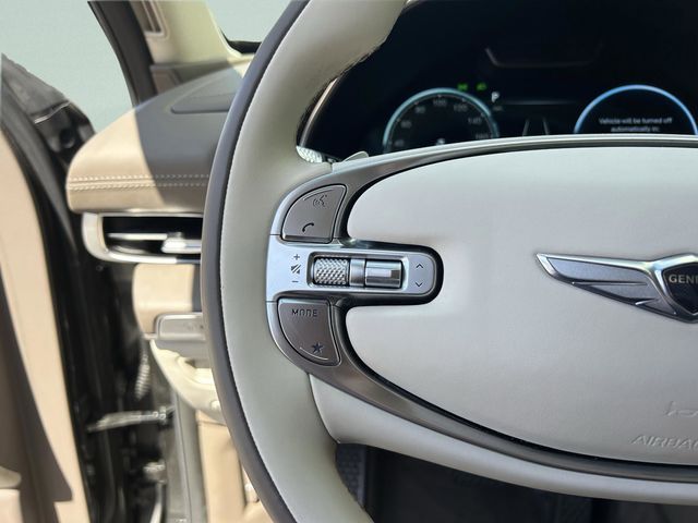 This vehicle comes equipped with 3.909 Axle Ratio, 4-Wheel Disc Brakes, ABS brakes, Adaptive suspension, Air Conditioning, Alloy wheels, AM/FM radio: SiriusXM, Android Auto & Apple CarPlay, Anti-whiplash front head restraints, Auto High-beam Headlights, Auto tilt-away steering wheel, Auto-dimming door mirrors, Auto-dimming Rear-View mirror, Automatic temperature control, Brake assist, Bumpers: body-color, Compass, Delay-off headlights, Driver door bin, Driver vanity mirror, Dual front impact airbags, Dual front side impact airbags, Electronic Stability Control, Emergency communication system: Genesis Connected Services, Exterior Parking Camera Rear, First Aid Kit, Four wheel independent suspension, Front anti-roll bar, Front Bucket Seats, Front Center Armrest, Front dual zone A/C, Front reading lights, Fully automatic headlights, Garage door transmitter: HomeLink, Genuine wood console insert, Genuine wood dashboard insert, Genuine wood door panel insert, Heated & Ventilated Front Bucket Seats, Heated door mirrors, Heated front seats, Heated steering wheel, Illuminated entry, Knee airbag, Leather steering wheel, Low tire pressure warning, Memory seat, Mudguards, Nappa Leather Seating Surfaces, Navigation System, Occupant sensing airbag, Outside temperature display, Overhead airbag, Overhead console, Panic alarm, Passenger door bin, Passenger vanity mirror, Power door mirrors, Power driver seat, Power Liftgate, Power moonroof, Power passenger seat, Power steering, Power windows, Radio data system, Rain sensing wipers, Rear air conditioning, Rear anti-roll bar, Rear reading lights, Rear seat center armrest, Rear side impact airbag, Rear window defroster, Rear window wiper, Remote keyless entry, Security system, Speed control, Speed-sensing steering, Speed-Sensitive Wipers, Split folding rear seat, Spoiler, Steering wheel memory, Steering wheel mounted audio controls, Tachometer, Telescoping steering wheel, Tilt steering wheel, Traction control, Trip computer, Turn signal indicator mirrors, Variably intermittent wipers, Ventilated front seats, and Wheel Locks .