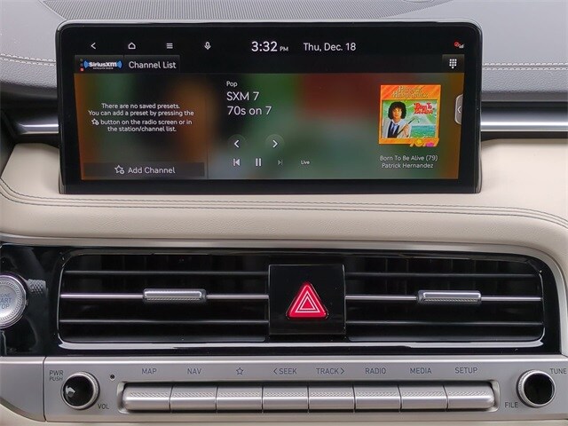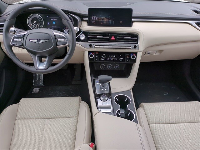 This vehicle comes equipped with Option Group 01, 4-Wheel Disc Brakes, 6 Speakers, ABS brakes, Air Conditioning, Alloy wheels, AM/FM radio: SiriusXM, Android Auto & Apple CarPlay, Anti-whiplash front head restraints, Auto High-beam Headlights, Auto-dimming Rear-View mirror, Automatic temperature control, Brake assist, Bumper Applique, Bumpers: body-color, Cargo Block, Delay-off headlights, Driver door bin, Driver vanity mirror, Dual front impact airbags, Dual front side impact airbags, Electronic Stability Control, Emergency communication system: Genesis Connected Services, Exterior Parking Camera Rear, First Aid Kit, Four wheel independent suspension, Front anti-roll bar, Front Bucket Seats, Front Center Armrest, Front dual zone A/C, Front reading lights, Fully automatic headlights, Garage door transmitter: HomeLink, Heated door mirrors, Heated front seats, Heated Multi-Adjustable Front Bucket Seats, Illuminated entry, Knee airbag, Leather steering wheel, Leatherette Seating Surfaces, Low tire pressure warning, Navigation System, Occupant sensing airbag, Outside temperature display, Overhead airbag, Overhead console, Panic alarm, Passenger door bin, Passenger vanity mirror, Power door mirrors, Power driver seat, Power passenger seat, Power steering, Power windows, Radio: AM/FM/HD Audio System, Rear anti-roll bar, Rear reading lights, Rear seat center armrest, Rear side impact airbag, Rear window defroster, Remote keyless entry, Reversible Cargo Tray, Security system, Speed control, Speed-Sensitive Wipers, Split folding rear seat, Steering wheel mounted audio controls, Tachometer, Telescoping steering wheel, Traction control, Trip computer, Turn signal indicator mirrors, Variably intermittent wipers, and Wheels: 19" x 8.0J Front and 19" x 8.5J Rear Alloy .