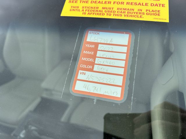 The price does not include tax, tag, license, an electronic filing fee of $449.00**, a private tag agency fee of $199.00**, and a predelivery service charge of $1199.00** **This charge represents costs and profit to the dealer for items such as inspecting, cleaning, and adjusting vehicles, as well as preparing documents related to the sale.* EPA-estimate metric: these are contingent on ideal conditions within a lab. Real-world situations such as carrying passengers or cargo, using climate control, driving style, and ambient temperatures can affect actual metrics. 15/19 City/Highway MPG 2022 Lexus GX 460 4WD 6-Speed Automatic with Sequential Shift ECT 4.6L V8 DOHC Dual VVT-i 32V